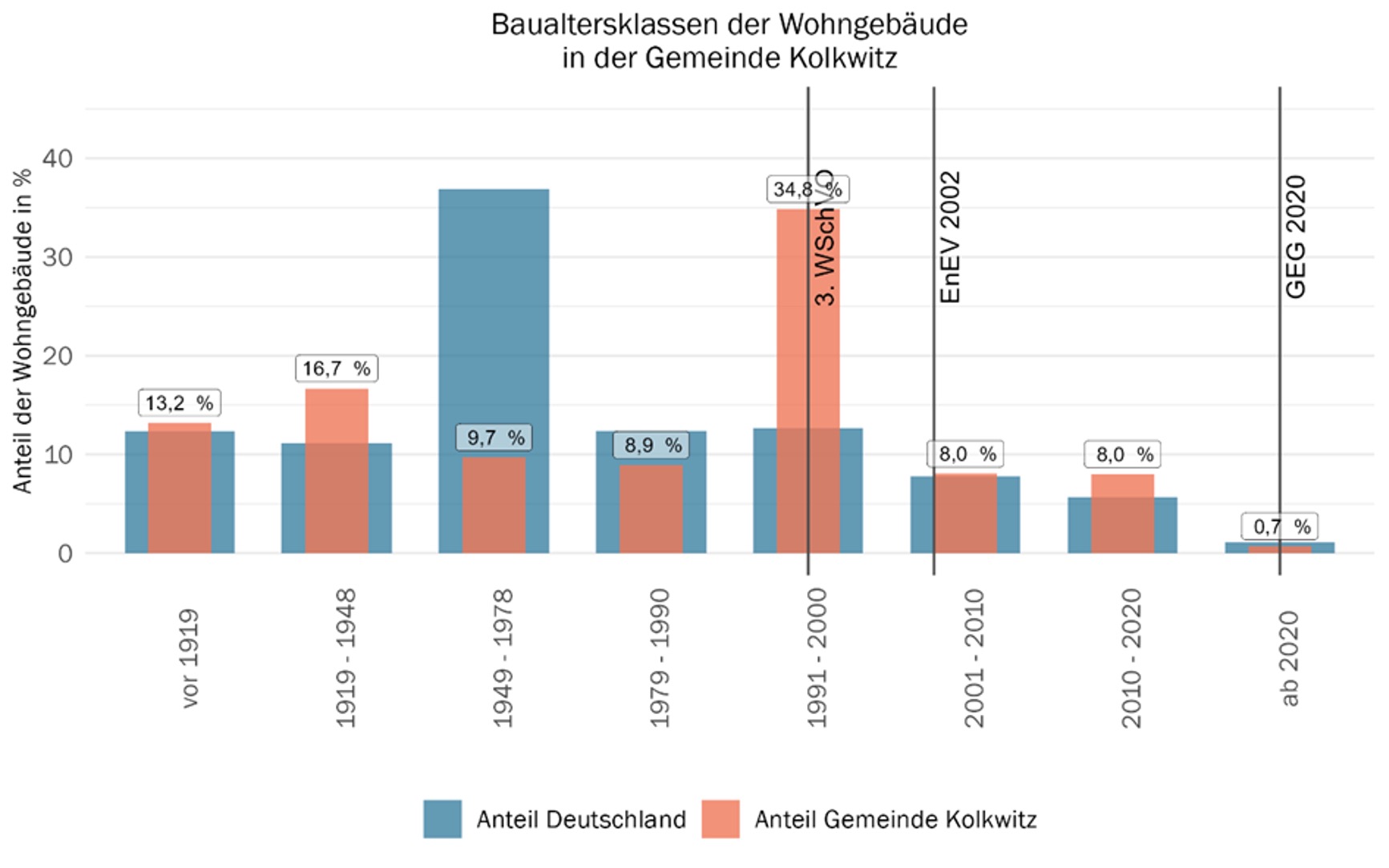 Kolkwitz weist einen teils älteren Gebäudebestand und einen erkennbaren Sanierungsbedarf auf. Die Wärmeversorgung ist stark von fossilen Energieträgern abhängig, Wärmenetze und erneuerbare Energien sind wenig etabliert. Der Austausch alter Heizungsanlagen und die Nutzung lokaler Wärmequellen bieten großes Potenzial für CO₂-Einsparungen.