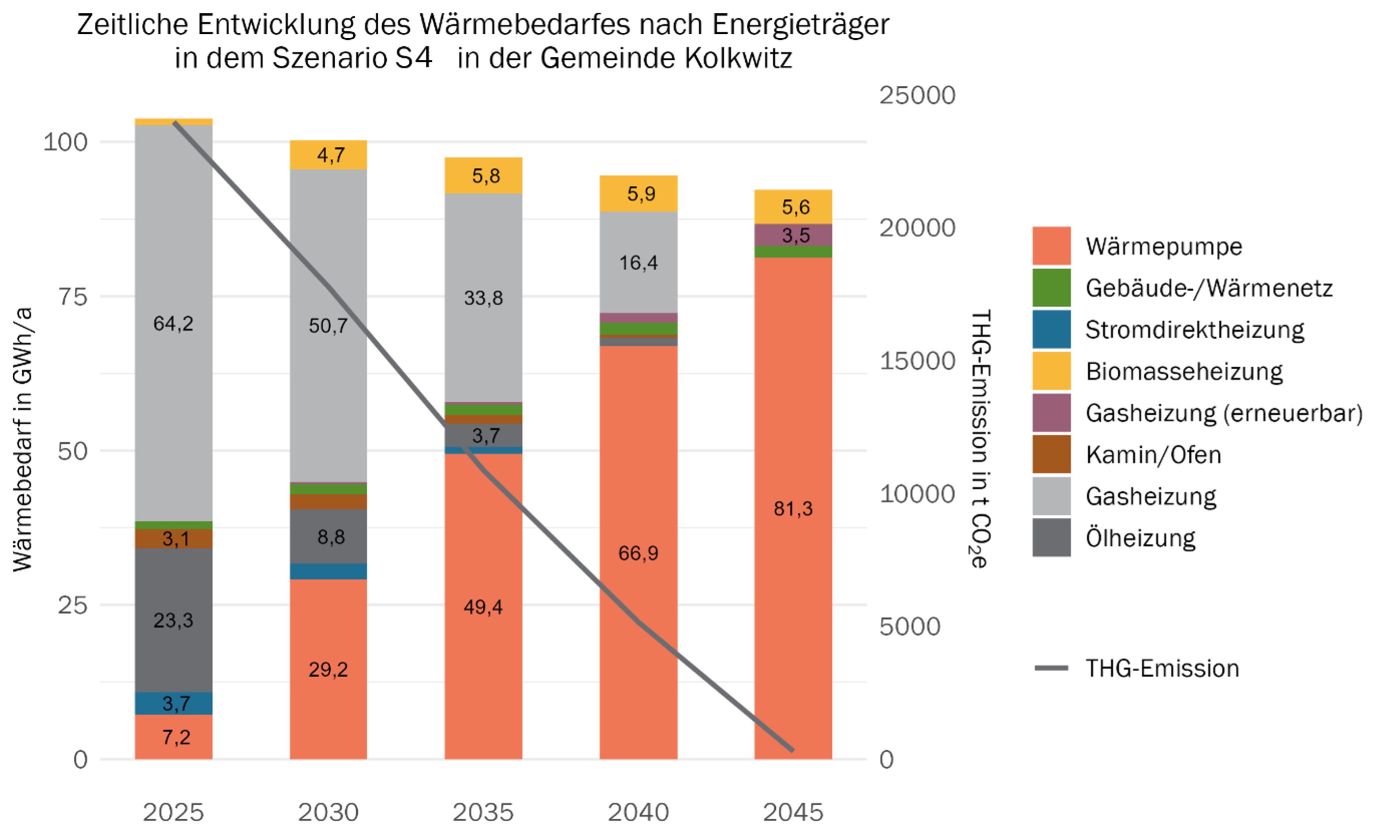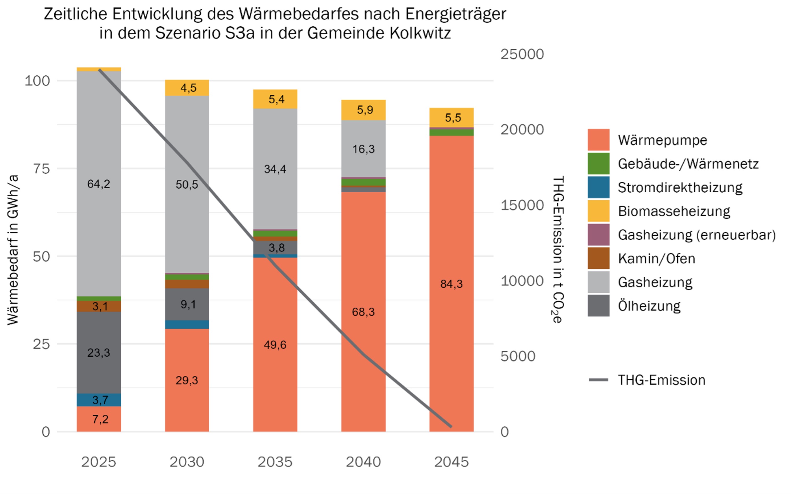 Um bis 2045 treibhausgasneutral zu werden, wurden für Kolkwitz mehrere Zukunftspfade („Szenarien“) berechnet. Sie unterscheiden sich u. a. in der Geschwindigkeit der Heizungsumstellung, den eingesetzten Technologien (z. B. Wärmepumpen, Wärmenetze, Biomethan) und der Rolle zentraler Infrastrukturen.